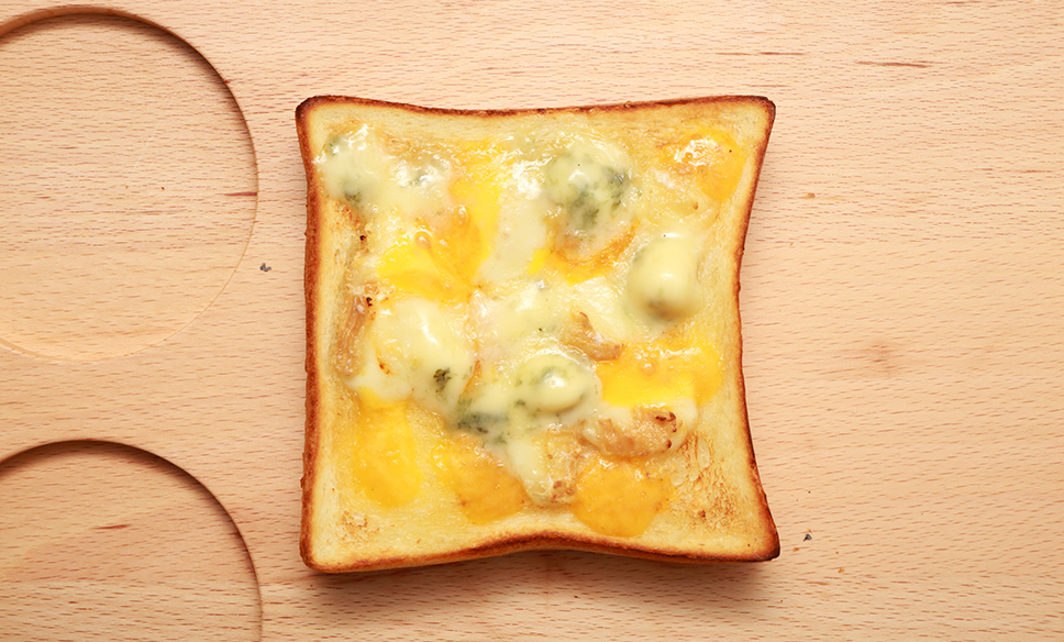 4種のチーズをのせてオーブンで焼き上げたトースト。温かいうちにどうぞ。