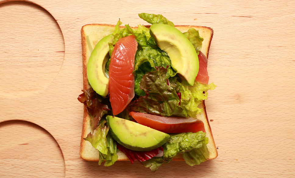 焼きたての食パンにスモークサーモンとアボカドのサラダをのせたサラダトースト。