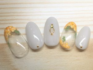 WEB予約の際は、ネイルパフェジェル1色塗り&ケアコース+アート有を選択後、コメント欄にミモザデザイン希望。と記載ください。価格12,000円(税込)